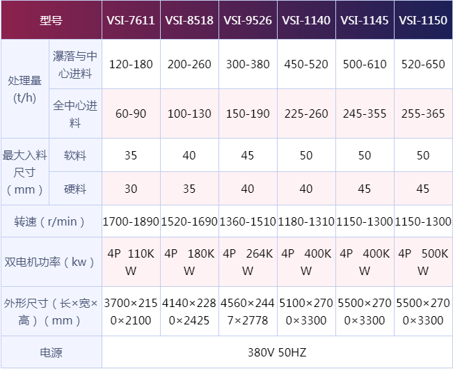 vsi沖擊式制砂機(jī)有好多種不一樣的規(guī)格型號(hào),而每種型號(hào)的打沙機(jī)搭配的電動(dòng)機(jī)、機(jī)械的轉(zhuǎn)速、所能解決的物料的粒度范圍和機(jī)械的總重量等是不一樣的,技術(shù)參數(shù)是用戶(hù)選購(gòu)機(jī)械時(shí)的重要參數(shù)資料,關(guān)于vsi沖擊式制砂機(jī)的詳細(xì)參數(shù)請(qǐng)看下文技術(shù)參數(shù)表。