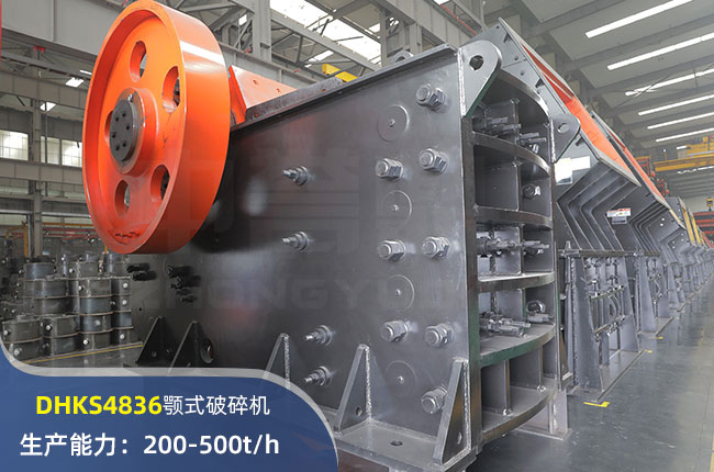 DHKS4836顎式破碎機(jī)進(jìn)料口尺寸1220×910mm,進(jìn)料粒度770mm,出料大小90-250mm,電機(jī)功率160kw,時(shí)產(chǎn)500噸左右。