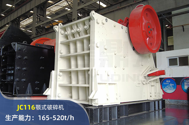 JC116顎式破碎機進料口尺寸1150×760mm,進料粒度≤640mm,出料大小≤70mm,電機功率110kw,時產(chǎn)量在520噸。