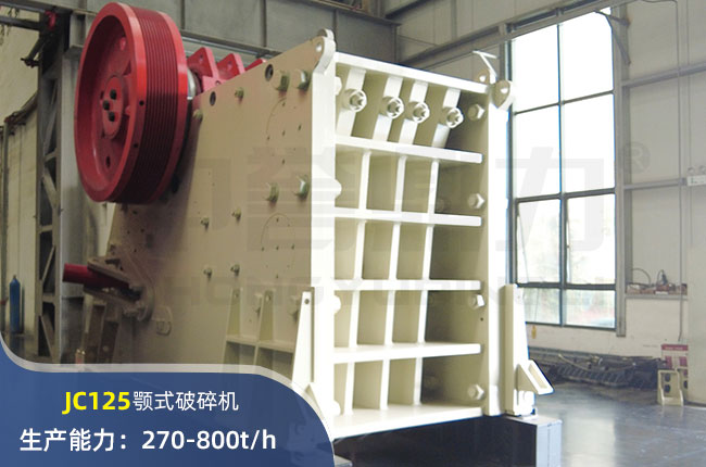 JC125顎式破碎機進(jìn)料口尺寸1250-950mm,進(jìn)料粒度≤810mm,出料大小≤100mm,電機功率160kw,時產(chǎn)量在800噸左右。