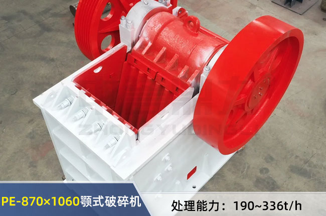 PE-870×1060顎式破碎機(jī)進(jìn)料尺寸是870×1060mm,進(jìn)料口寬大,可通過(guò)粒度≤660mm的礦石物料,每小時(shí)的處理能力在190-336噸,排料口調(diào)整范圍200-260mm。