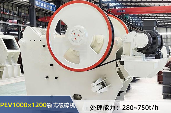 PEV1000×1200顎式破碎機它允許破碎<850mm的物料,能加工出150~300mm之間的碎石,可加工花崗巖、玄武巖、鵝卵石等各類礦石,每小時產(chǎn)量280-750噸。