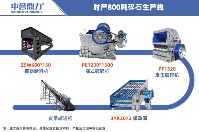 設(shè)備配置方案:ZSW600*150振動給料機、PE1200*1500顎式破碎機、PF1520反擊式破碎機、3YK3072振動篩分機、輸送機。