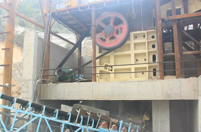 礦山顎破結(jié)構(gòu)原理礦山顎破方式為曲動(dòng)擠壓型,電機(jī)驅(qū)動(dòng)皮帶和皮帶輪,通過偏心軸使動(dòng)顎上下運(yùn)動(dòng),當(dāng)動(dòng)顎上升時(shí)肘板和動(dòng)顎間夾角變大,從而動(dòng)顎板向定顎板接近,與此此時(shí)