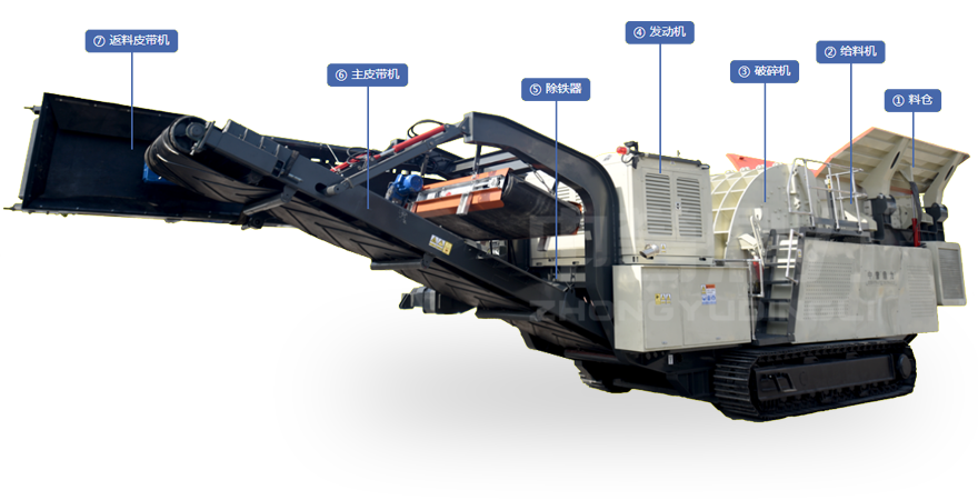 | ⑦返料皮帶機 | 將篩分履帶站的頭層物料輸送到破碎機 |