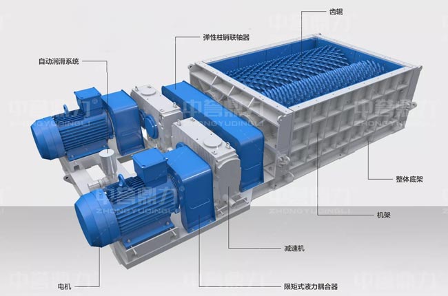 中譽(yù)鼎力雙齒輥式破碎機(jī)組成部分包括電機(jī)、自動(dòng)潤滑系統(tǒng)、彈性柱銷聯(lián)軸器、齒輥、整體底架、機(jī)架、減速機(jī)、限矩式液力耦合器組成。