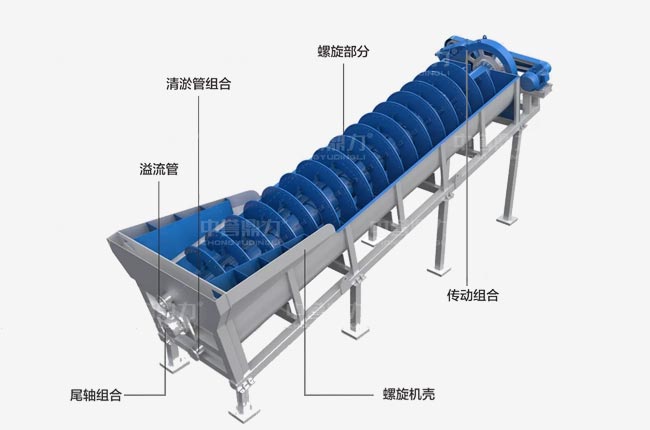 中譽鼎力螺旋洗砂機的結(jié)構(gòu)組成包括尾軸組合、螺旋機殼、傳動組合、螺旋部分、清淤管組合、溢流管。