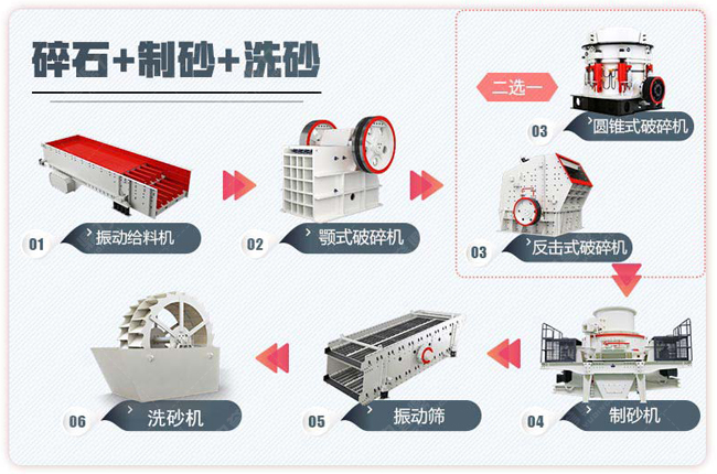 把礦石粉碎成砂石,需要配置初碎、二段破碎、整型破碎機械,再配置喂料、篩選分級、傳送機械,構(gòu)成一條骨料線,加工環(huán)節(jié)配置如下: