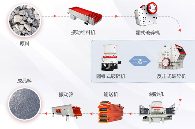 大型:喂料機(jī)+顎破機(jī)(初級破碎)+圓錐石子機(jī)(二破)+制砂機(jī)械+洗石機(jī)(選配)+篩機(jī)