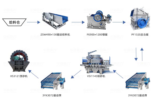 上述流程圖為912碎石機(jī)破碎制砂流程圖,即可生產(chǎn)石子骨料還可以生產(chǎn)機(jī)制砂、水洗砂。