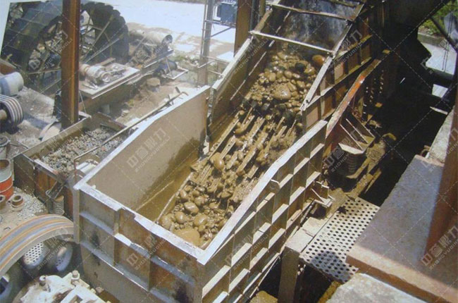 加工原料經振動送料機定期、定向將加工原料送入pe鄂破機進行粗碎,送料的此時,預先篩選分級出加工原料中夾雜的異物,防止其進入碎石機的機腔,毀壞機器,從pe鄂破機出來后,振動篩篩選出破碎合格的部分送入二級破石機械(反擊礦山碎石機、圓錐碎石機)進行二段破碎,破碎至更小的顆粒,便于進行制砂處置,石子打砂機對二段破碎合格的加工原料進行沖擊制砂,根據(jù)成品要求,將性能調改至滿意數(shù)據(jù),生產出期望粒度的成品砂石,加工原料從石子打砂機出來,會攜帶有揚塵,砂石洗選機械可以將包覆在砂石表面的揚塵,和中間夾雜的異物清洗干凈,后獲得干凈的河道石成品砂石。