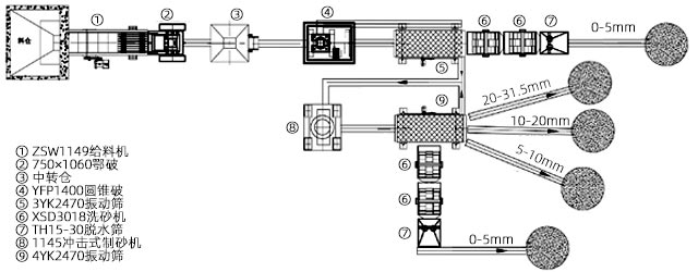 典型“鄂破+圓錐破+制砂機”三段制砂工藝,通過兩道工序篩分,配以洗砂設備實現水洗機制砂,以提高成品砂潔凈程度。