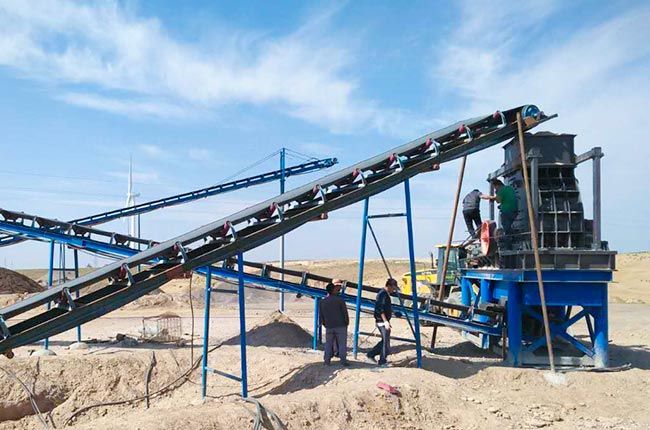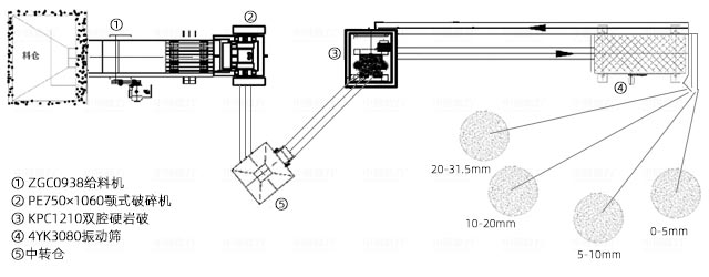 | 方案一 | PE750×1060顎式破碎機+HPT400圓錐破碎機+VSI6X1040整形制砂機+4YK2460振動篩+配套設(shè)備 | 顎破機粗碎,圓錐破中細碎,沖擊式制砂機整形,能生產(chǎn)出多種規(guī)格、形狀好的成品砂石,有洗沙需求,可配置洗沙設(shè)備 |
