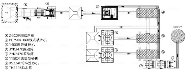 “鄂破+圓錐破+沖擊破”三段破碎方案,加上兩級篩分工藝,結(jié)合輪斗洗砂機、脫水篩設(shè)備對機制砂清洗作業(yè),實現(xiàn)高品質(zhì)機制砂生產(chǎn)。