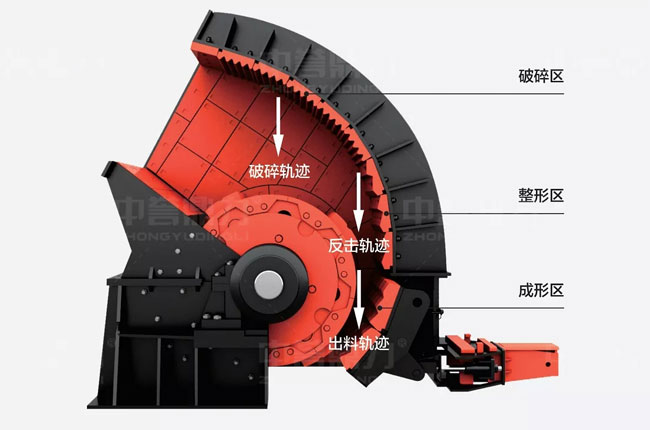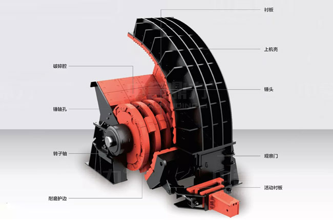 在物料進(jìn)入箱式破碎機后,經(jīng)過高速旋轉(zhuǎn)的錘頭沖擊而進(jìn)行破碎,破碎后的物料在錘頭處獲得動能,高速沖向破碎襯板,同時相互撞擊,經(jīng)過多次破碎,小于篩條之間間隙的物料,就會從間隙中排出,較大的物料在篩條上再次經(jīng)過錘頭沖擊,直到可以被排出。
