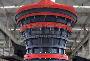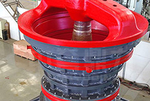 旋回式破碎機(jī)主要以機(jī)座、偏心套、轉(zhuǎn)動(dòng)、破碎圓錐、中架體、橫梁、油缸等部件組成。