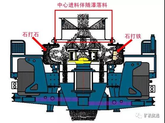 PCL制砂機(jī)單一的進(jìn)料方式?jīng)Q定了它的易損件壽命較短,而VSI不同: