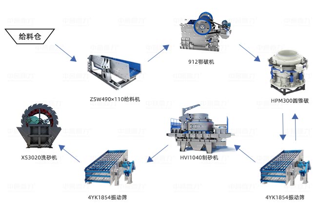方案二:適合原料粒度≤300mm,采用破碎機、制砂機、振動篩和輸送機工藝,破碎機負責破碎、制砂機細碎制砂。