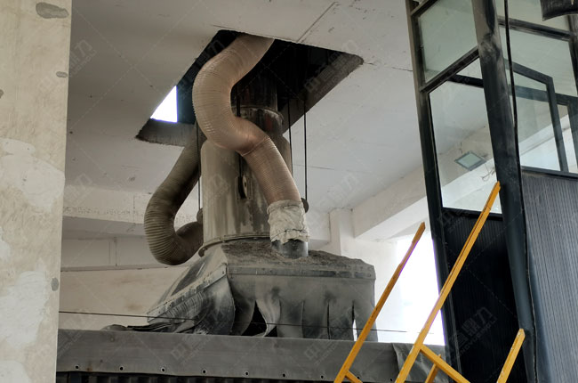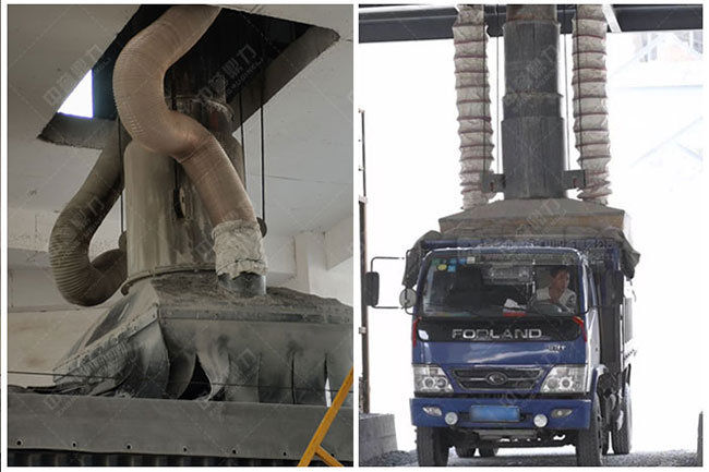 料倉(cāng)自動(dòng)放料裝車(chē)系統(tǒng)配用了一種砂石料無(wú)塵裝車(chē)裝置,包括卸料斗、升降控制裝、卸料筒體等,環(huán)保環(huán)節(jié)包括吸塵管、收塵器、伸縮套管等,吸料管設(shè)置在卸料筒體兩側(cè),卸料口處有皮質(zhì)吸塵罩抑塵,利于吸料管收集卸料揚(yáng)塵。